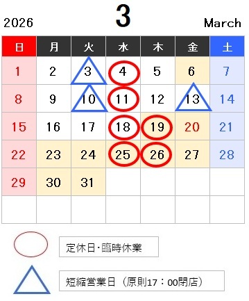 - 2026年3月の定休日・短縮営業日・臨時休業